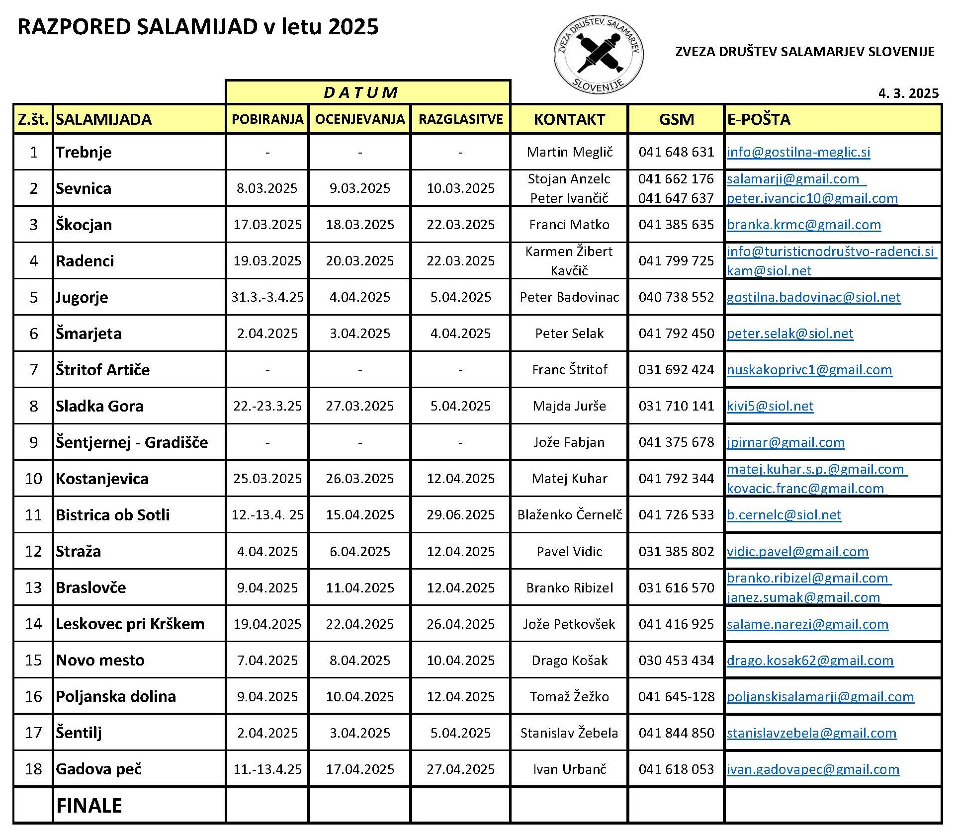 Spisek vseh letošnjih organizatorjev salamijad, članov Zveze društev salamarjev Slovenije